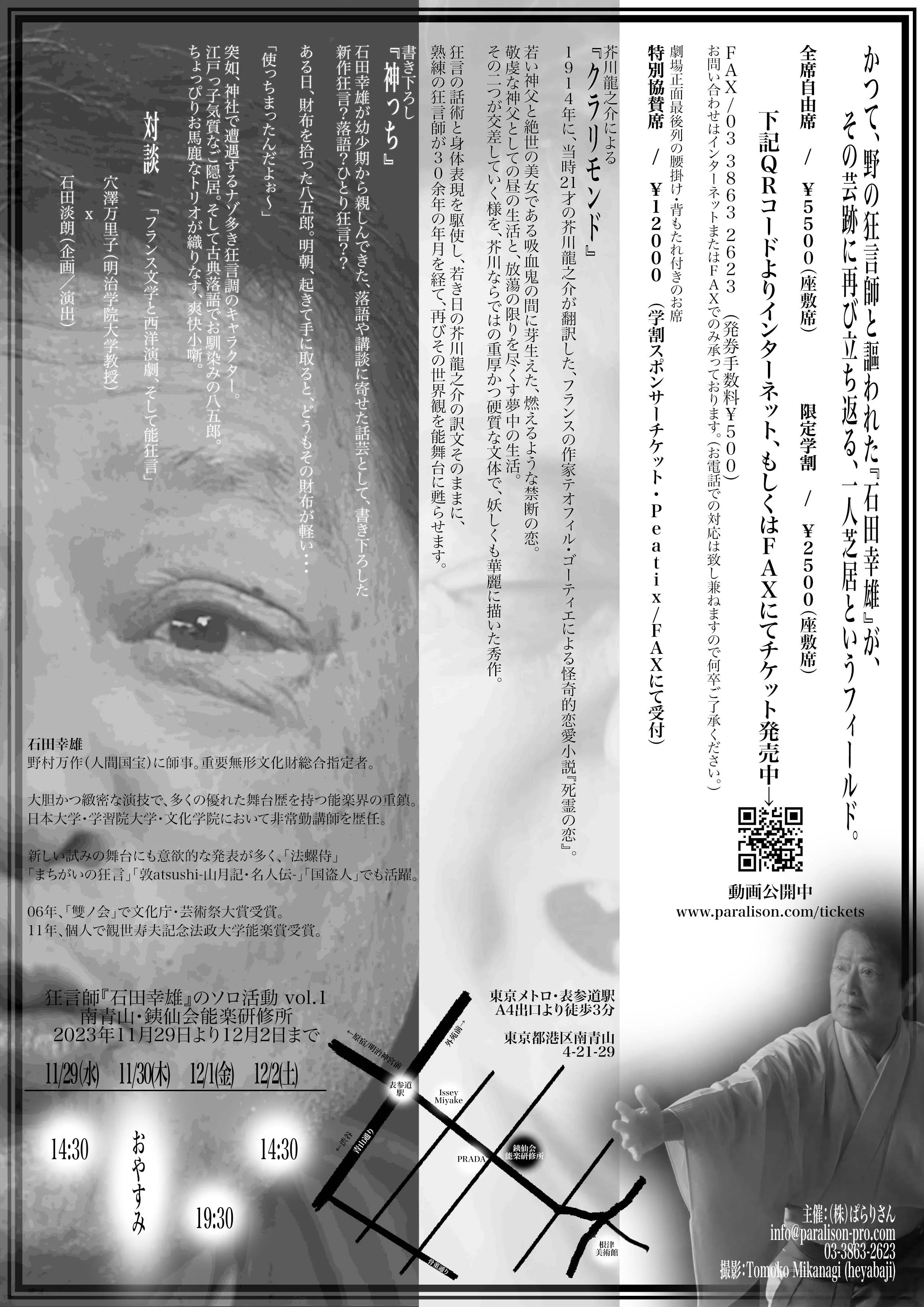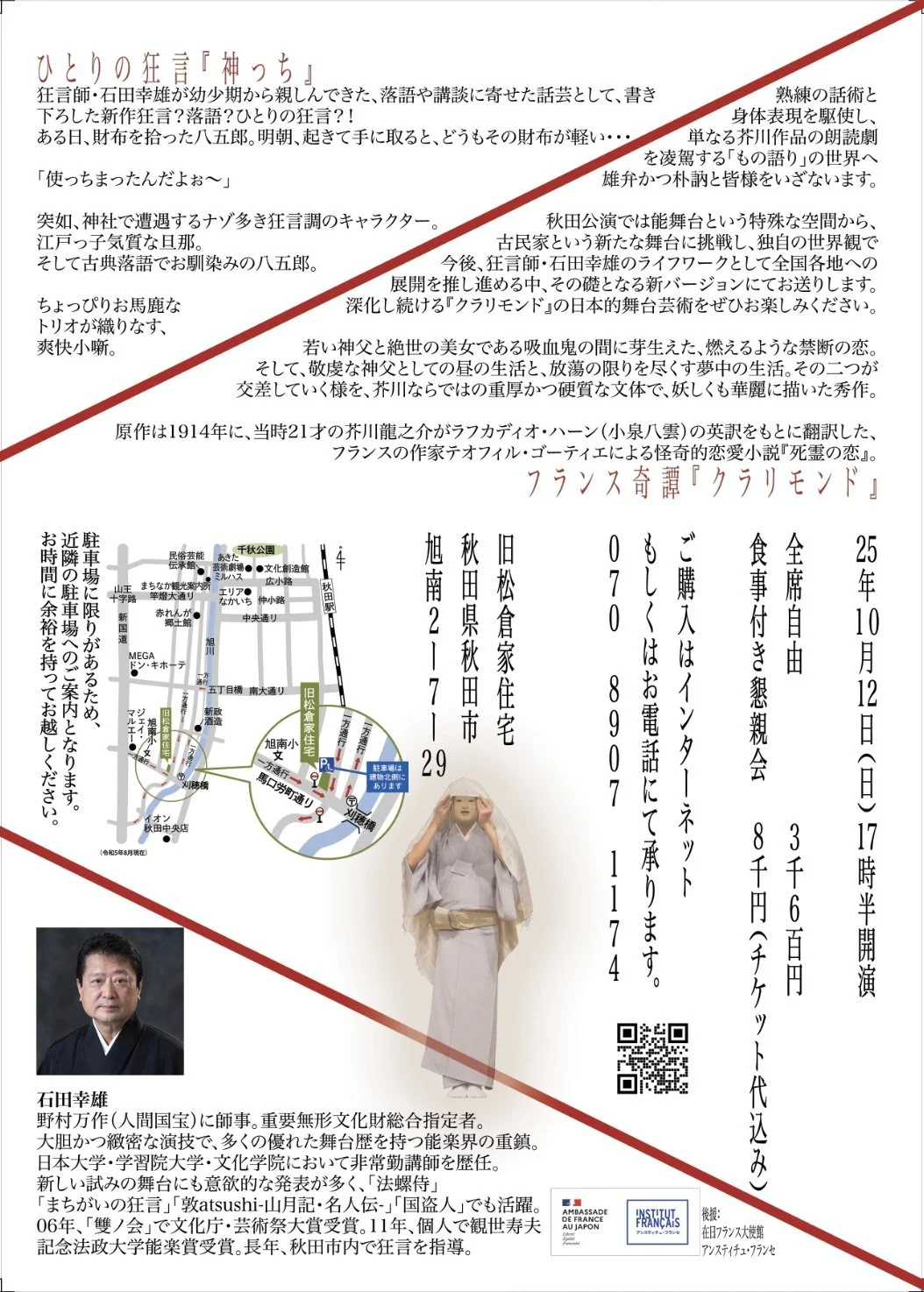 秋田公演では能舞台という特殊な空間から、古民家という新たな舞台に挑戦し、独自の世界観で今後、狂言師・石田幸雄のライフワークとして全国各地への展開を推し進める中、その礎となる新バージョンにてお送りします。